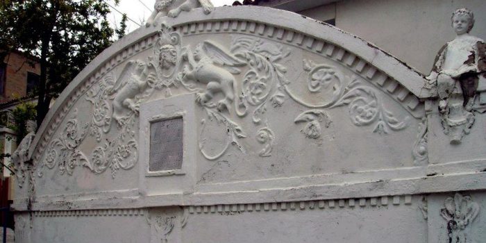 Με έκδηλη τη συµµετρικότητα στη διευθέτηση του όλου διακόσµου, δύο αντωποί φτερωτοί γρύπες υποβαστάζουν γυναικεία κεφαλή µέσα σε περίτεχνο ωοειδές πλαίσιο. Και ακριβώς από κάτω του, στο µέσον της πρόσοψης η ορθογώνια µαρµάρινη κτητορική πλάκα. Στην υπόλοιπη επιφάνεια αναπτύσσονται ελικοειδώς κλάδοι ακάνθου µε άνθους στις απολήξεις τους. Την κορυφή του «αετώµατος» καταλαµβάνει µεγαλόπρεπα, σαν κεντρικό ακρωτήριο ολόγλυφο καθισµένο λιοντάρι, ενώ δύο καθιστές παιδικές µορφές, ολόγλυφες και αυτές, αποτελούν τα πλαϊνά ακρωτήρια. Με εξαίρεση τα τελευταία, που ο συµβολισµός τους, µένει κρυφός για µας, ο υπόλοιπος διάκοσµος µοιράζεται σε δύο ευανάγνωστα συµβολικά πεδία: Από τη µια µεριά τα θαλερά φυτικά µοτίβα, δηλωτικά της ζωοδότρας δύναµης του νερού. Κι από την άλλη, οι δαιµονικοί γρύπες και το λιοντάρι, αποτρόπαια και φύλακες συνάµα της κρήνης. Προς το ίδιο συµβολικό πεδίο κλείνει και η γυναικεία κεφαλή που υποβαστάζουν οι γρύπες. Θα πρέπει δηλαδή να την νοήσουµε κι αυτή σαν αποτροπαϊκή µορφή, γοργόνειο ίσως.